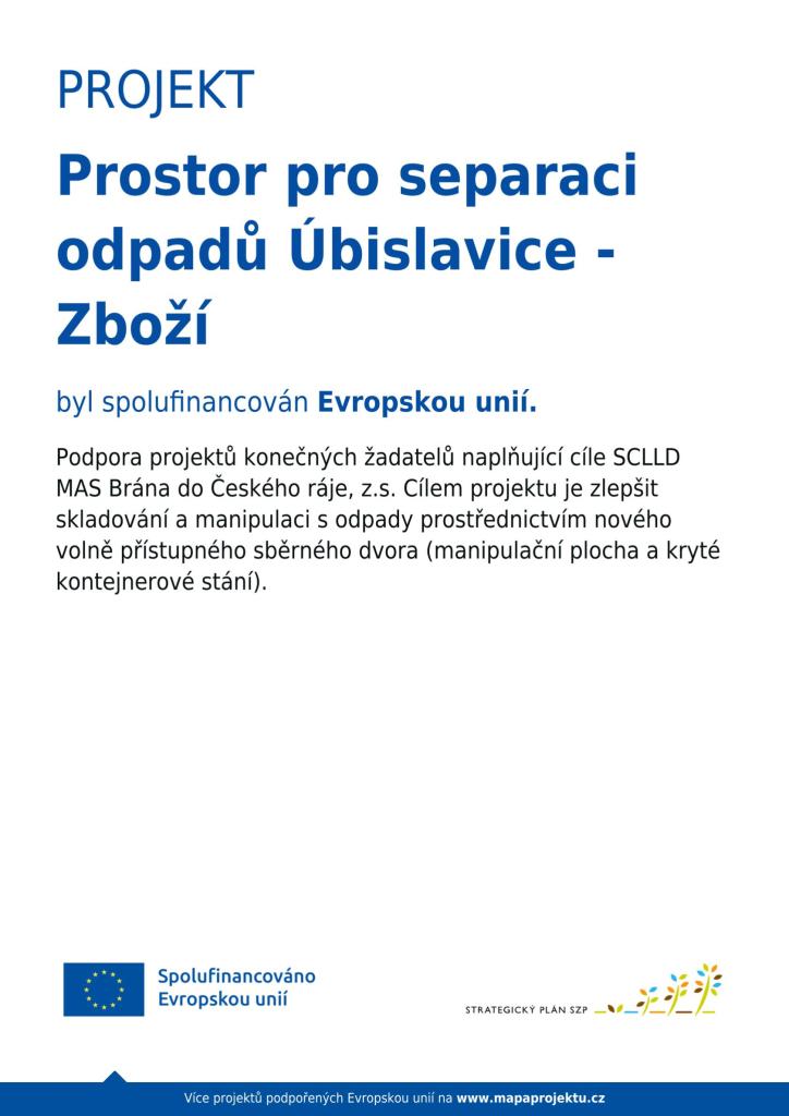 Vybudování nových prostor pro separaci odpadů Úbislavice – Zboží představuje investici do modernizace obecní infrastruktury, která mohla být realizována díky podpoře MAS Brána do Českého ráje, z.s. (www.masbcr.cz) a finančních prostředků EU na realizaci její Strategie komunitně vedeného místního rozvoje.